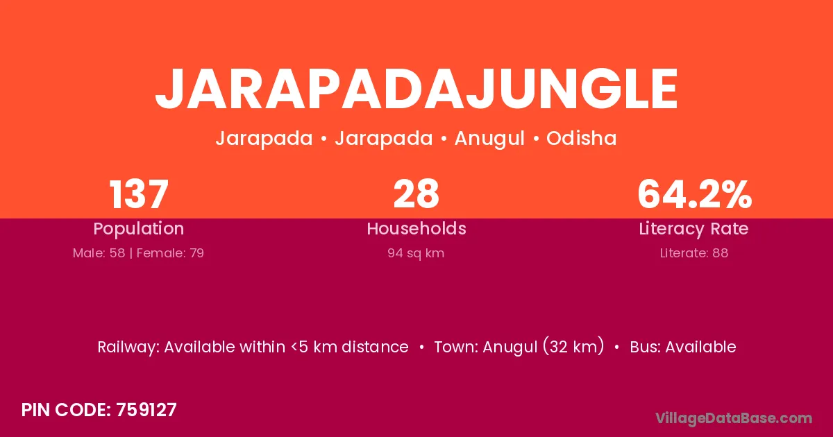 Anugul (32 km) is the nearest town to Jarapadajungle village for major economic activities and is located approximately 32 km away.