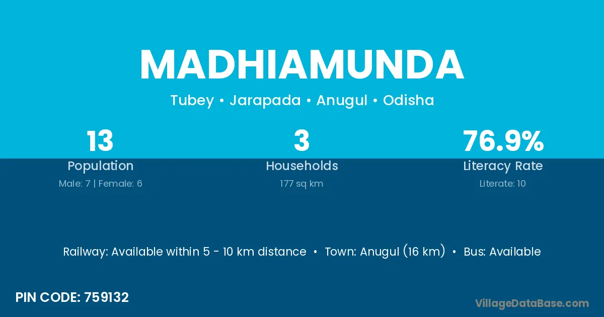 Anugul (16 km) is the nearest town to Madhiamunda village for major economic activities and is located approximately 16 km away.
