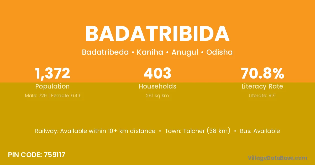 Talcher (38 km) is the nearest town to Badatribida village for major economic activities and is located approximately 38 km away.