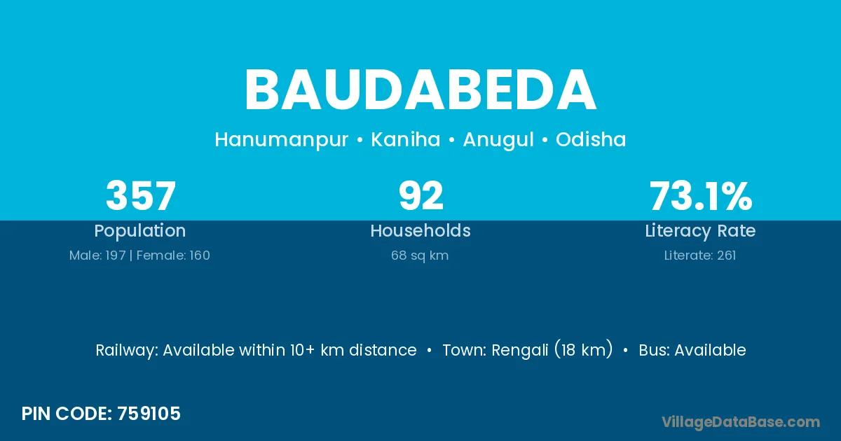 Rengali (18 km) is the nearest town to Baudabeda village for major economic activities and is located approximately 18 km away.