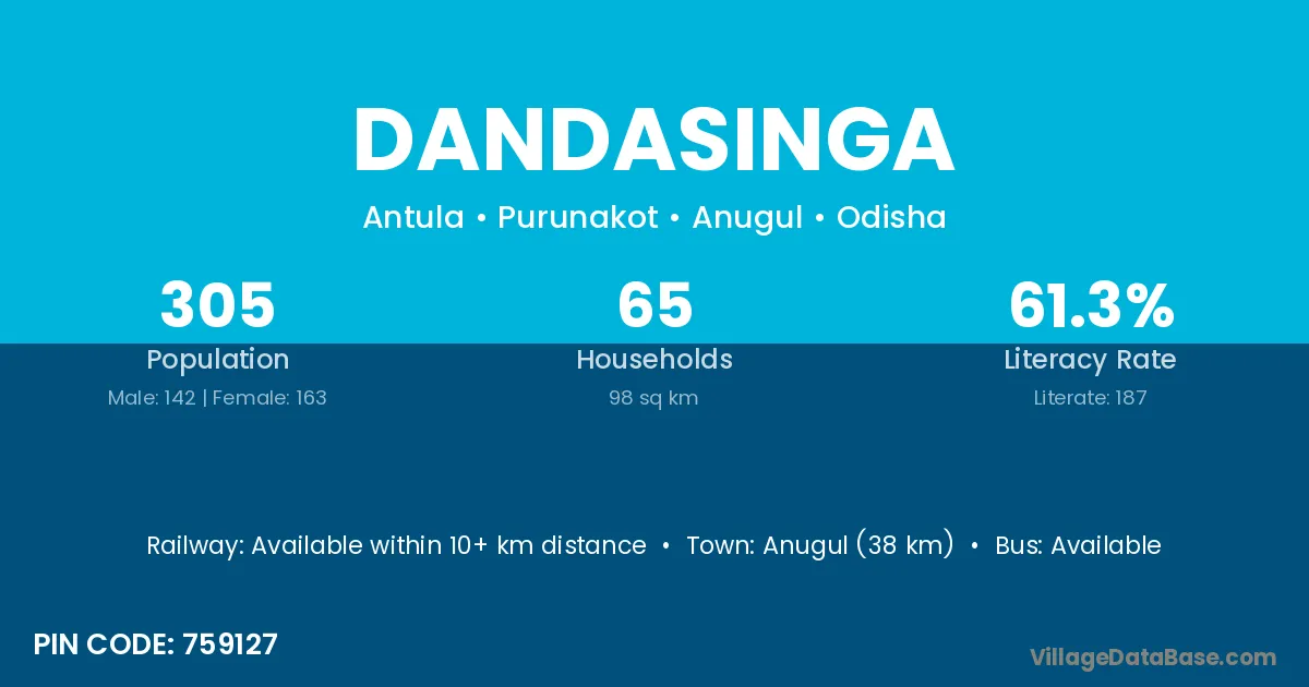 Talcher (30 km) is the nearest town to Dandasinga village for major economic activities and is located approximately 30 km away.