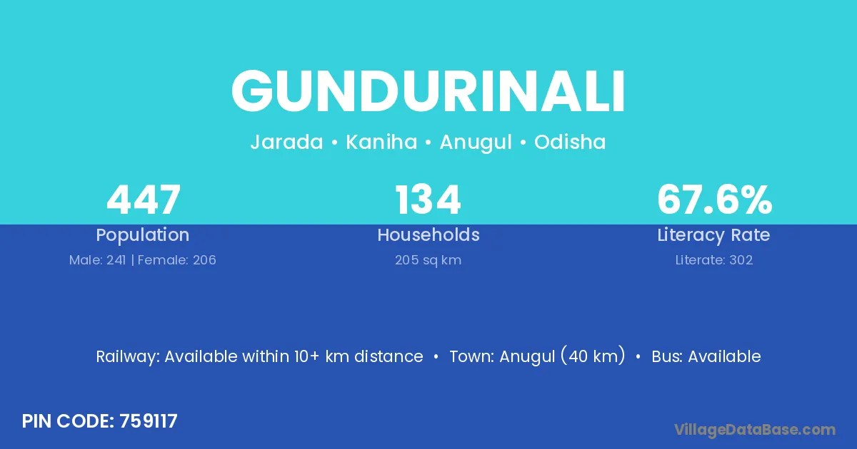 Anugul (40 km) is the nearest town to Gundurinali village for major economic activities and is located approximately 40 km away.