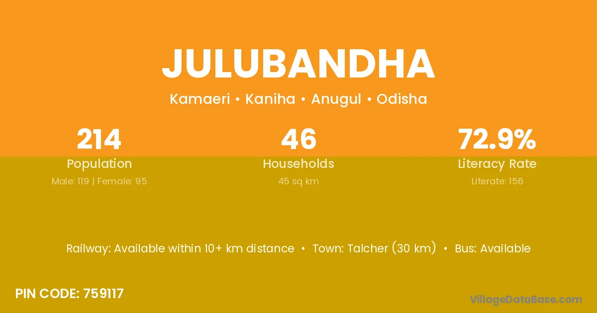 Talcher (30 km) is the nearest town to Julubandha village for major economic activities and is located approximately 30 km away.