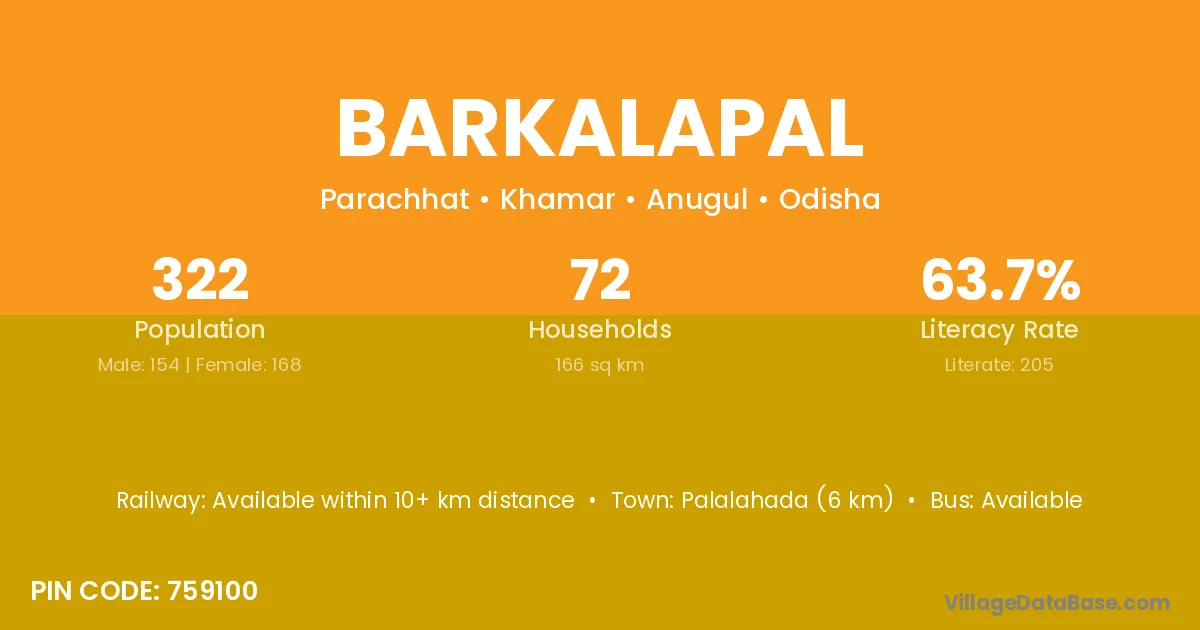 Barkalapal village has a total population of 322 people, of which 154 are males and 168 are females.