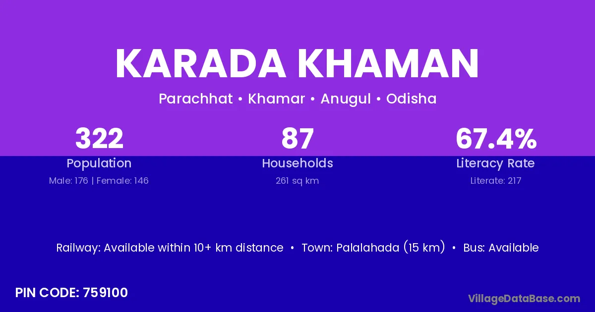 Palalahada (15 km) is the nearest town to Karada Khaman village for major economic activities and is located approximately 15 km away.