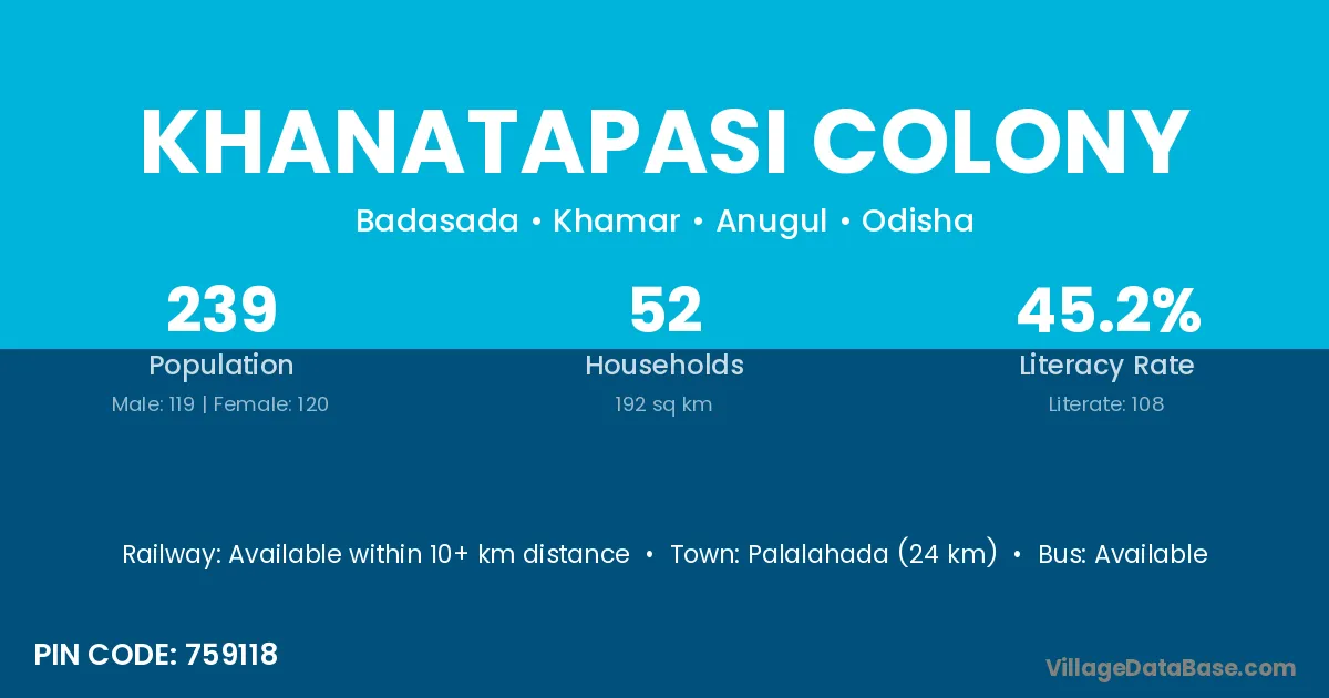 Palalahada (24 km) is the nearest town to Khanatapasi Colony village for major economic activities and is located approximately 24 km away.