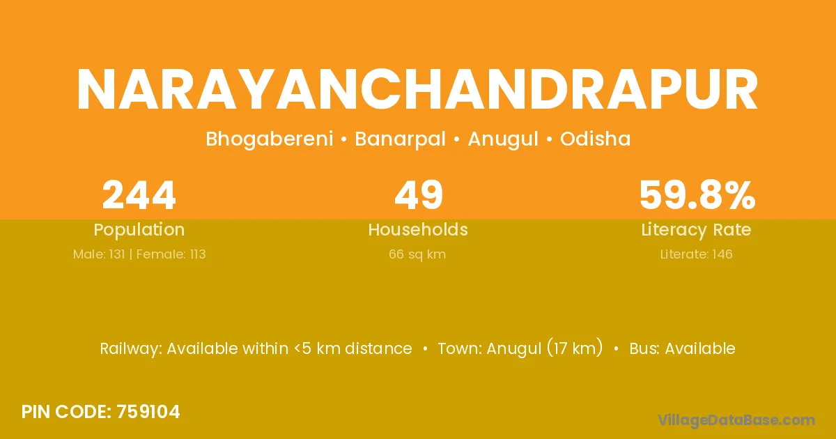 Palalahada (35 km) is the nearest town to Narayanchandrapur village for major economic activities and is located approximately 35 km away.