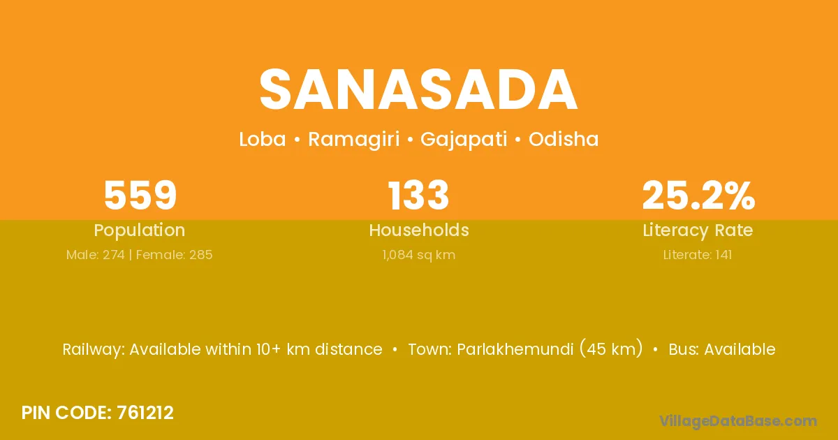 Palalahada (23 km) is the nearest town to Sanasada village for major economic activities and is located approximately 23 km away.
