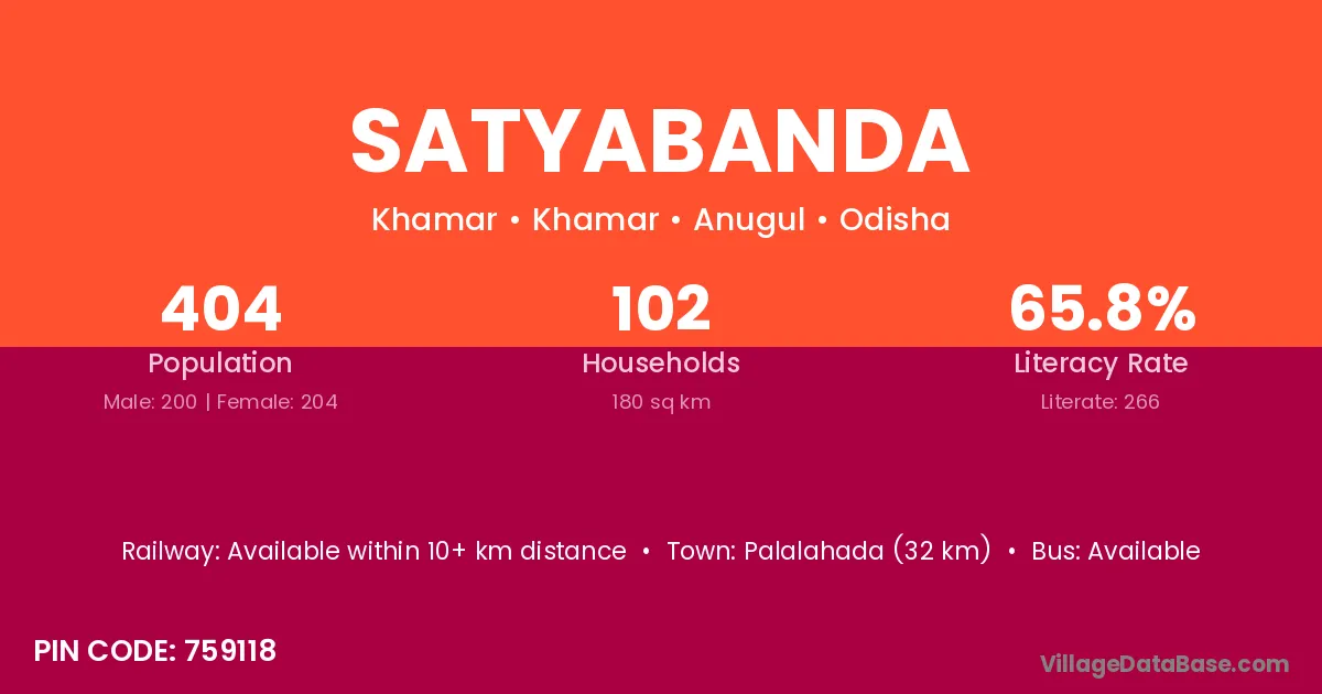 Palalahada (32 km) is the nearest town to Satyabanda village for major economic activities and is located approximately 32 km away.