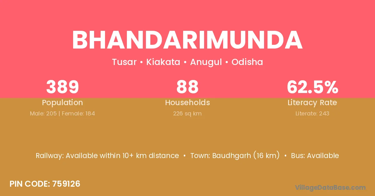 Bhandarimunda village has a total population of 389 people, of which 205 are males and 184 are females.