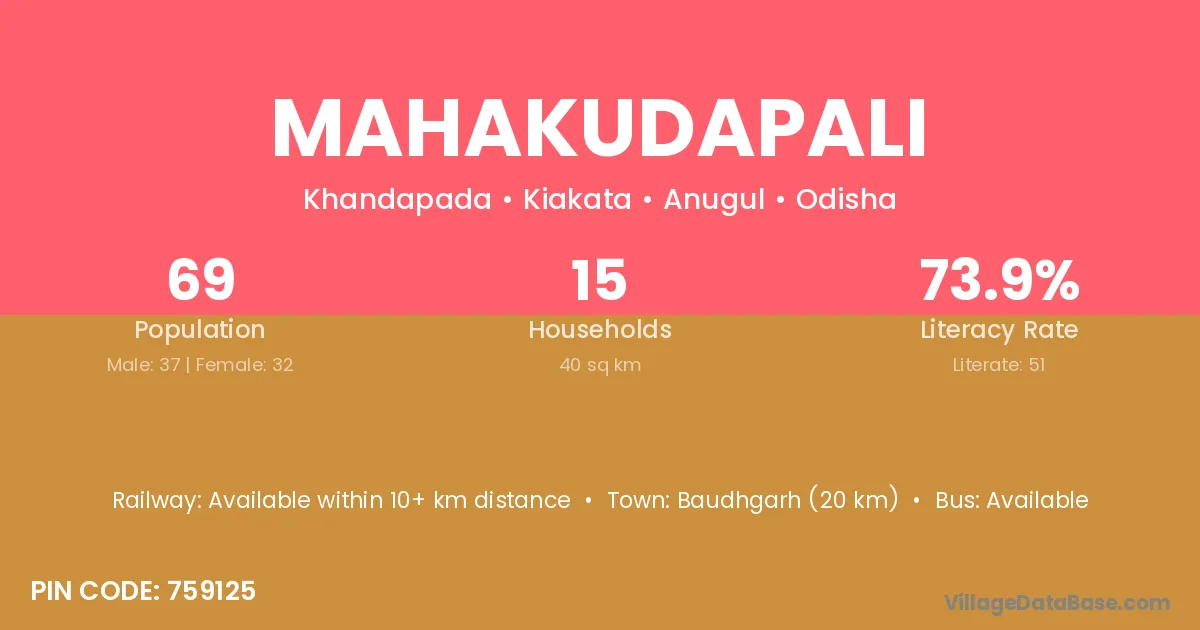 Mahakudapali village has a total population of 69 people, of which 37 are males and 32 are females.