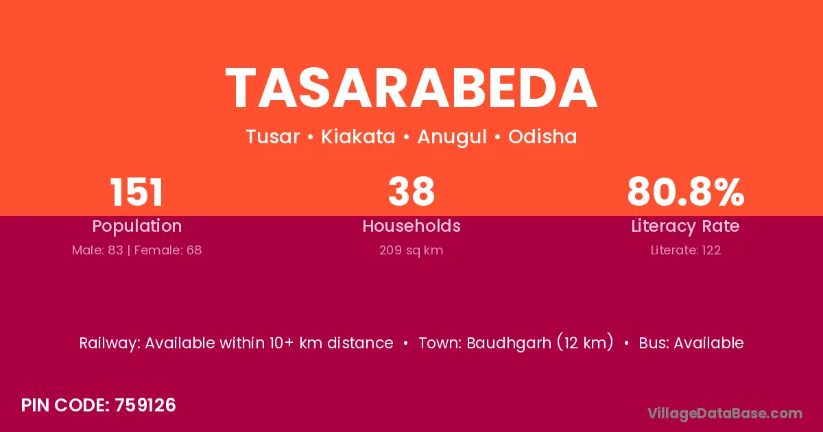 Tasarabeda village has a total population of 151 people, of which 83 are males and 68 are females.
