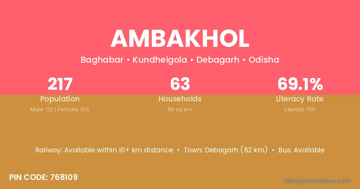 Athamallik (72 km) is the nearest town to Ambakhol village for major economic activities and is located approximately 72 km away.