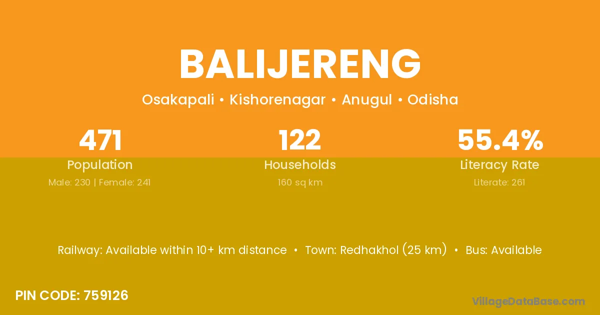 Redhakhol (25 km) is the nearest town to Balijereng village for major economic activities and is located approximately 25 km away.