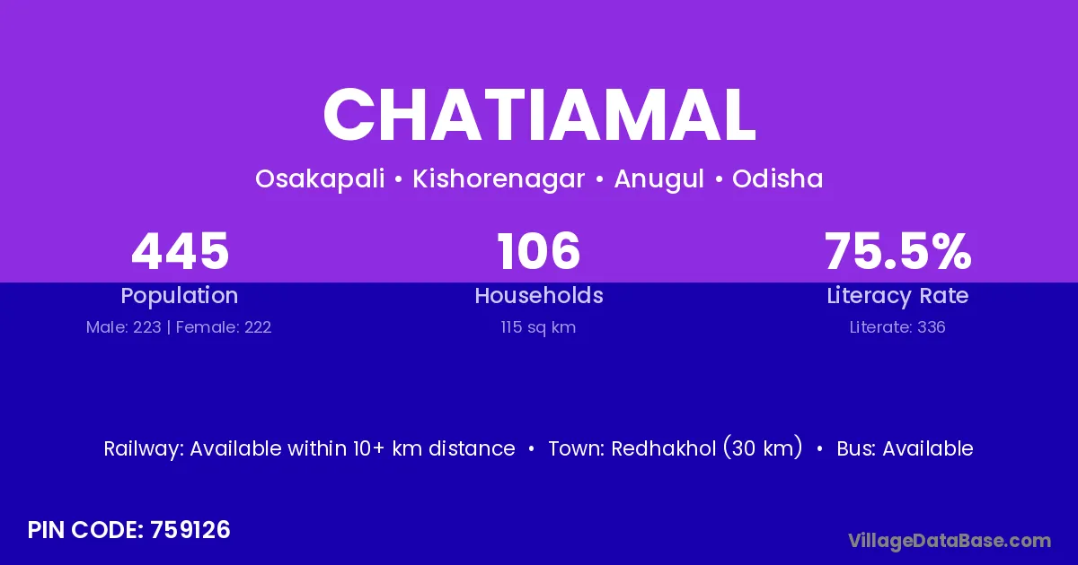 Chatiamal village has a total population of 445 people, of which 223 are males and 222 are females.
