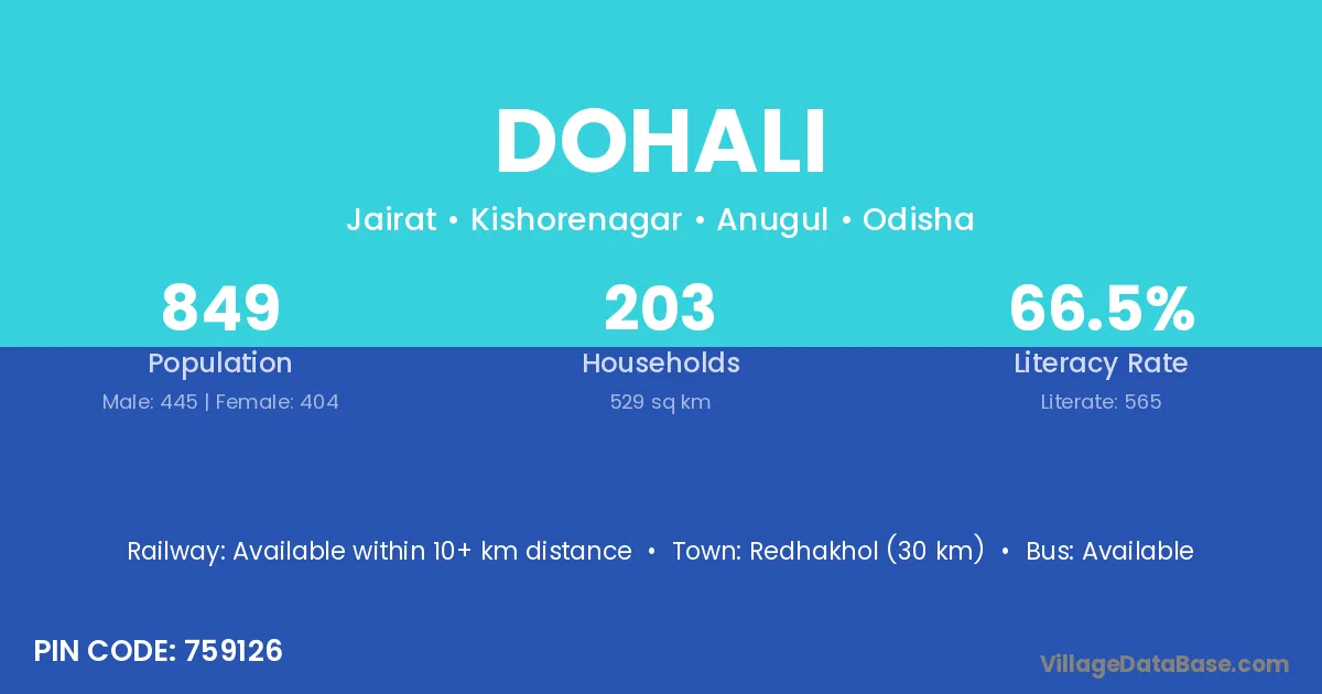 Redhakhol (30 km) is the nearest town to Dohali village for major economic activities and is located approximately 30 km away.