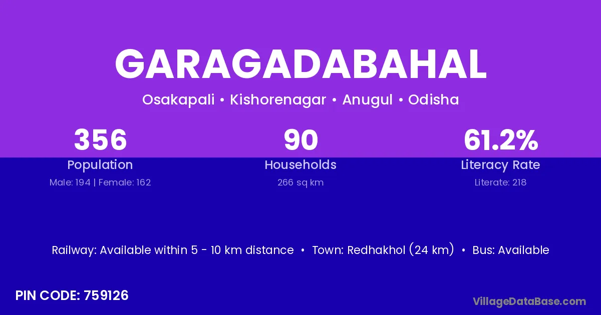 Redhakhol (24 km) is the nearest town to Garagadabahal village for major economic activities and is located approximately 24 km away.