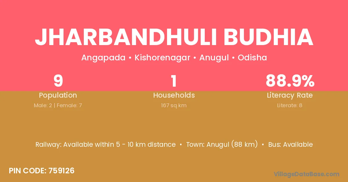 Anugul (88 km) is the nearest town to Jharbandhuli Budhia village for major economic activities and is located approximately 88 km away.
