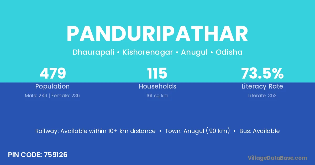 Anugul (90 km) is the nearest town to Panduripathar village for major economic activities and is located approximately 90 km away.