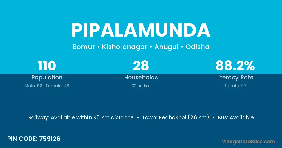 Redhakhol (26 km) is the nearest town to Pipalamunda village for major economic activities and is located approximately 26 km away.
