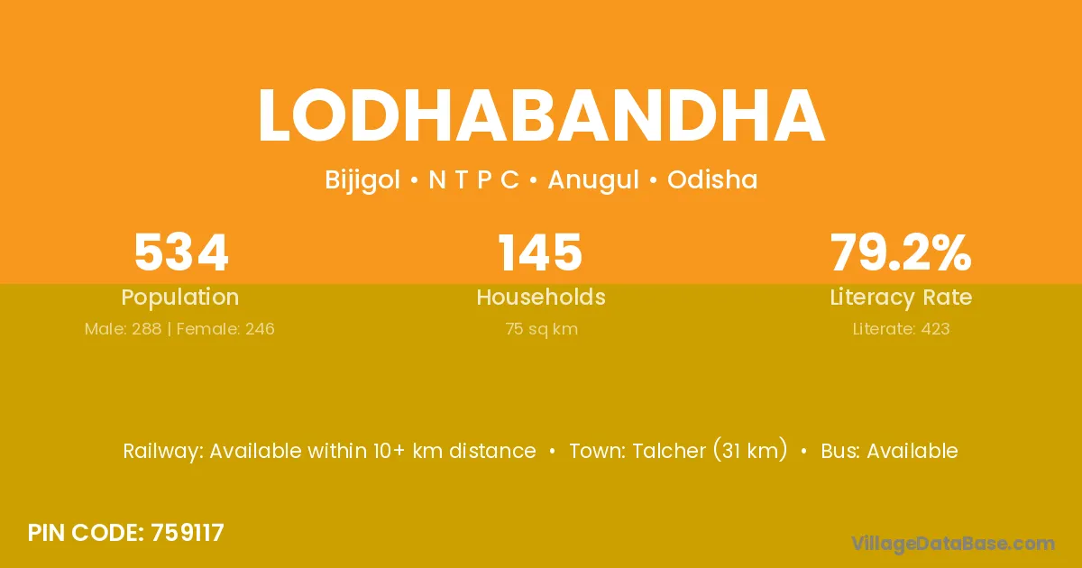 Talcher (31 km) is the nearest town to Lodhabandha village for major economic activities and is located approximately 31 km away.