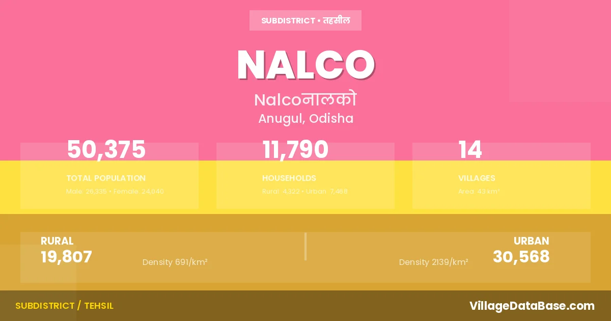 According to the 2011 census The total area of NALCO Tehsil is 43 km², with a population of 50375 people. The population density is 1,173 inhabitants per square kilometre, and there are approximately 11790 houses in the sub district.