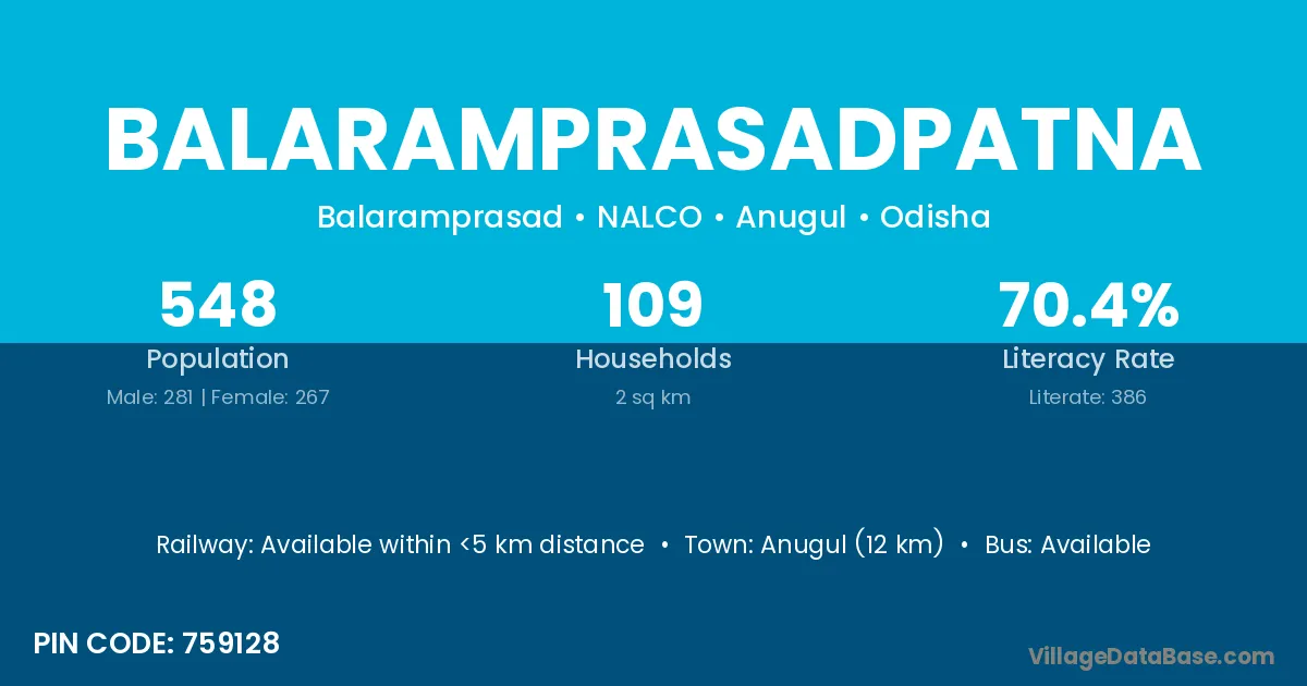 Anugul (12 km) is the nearest town to Balaramprasadpatna village for major economic activities and is located approximately 12 km away.