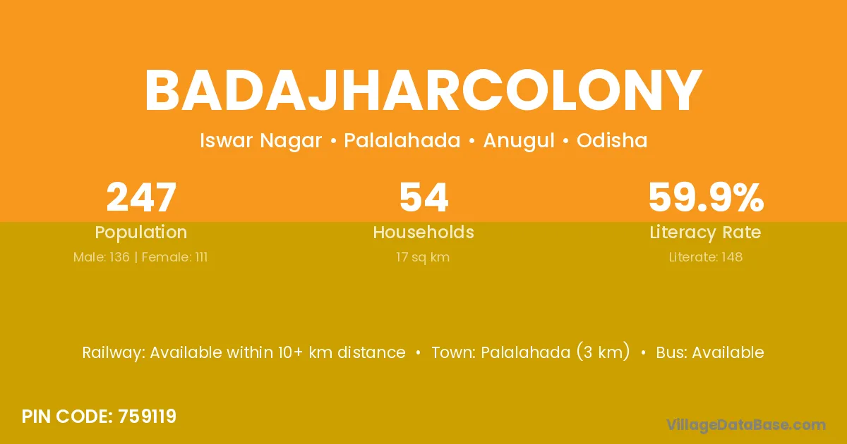 Palalahada (3 km) is the nearest town to Badajharcolony village for major economic activities and is located approximately 3 km away.
