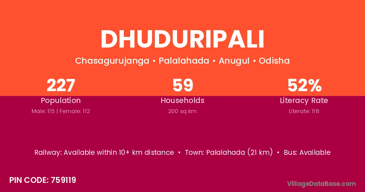 Dhuduripali village has a total population of 227 people, of which 115 are males and 112 are females.