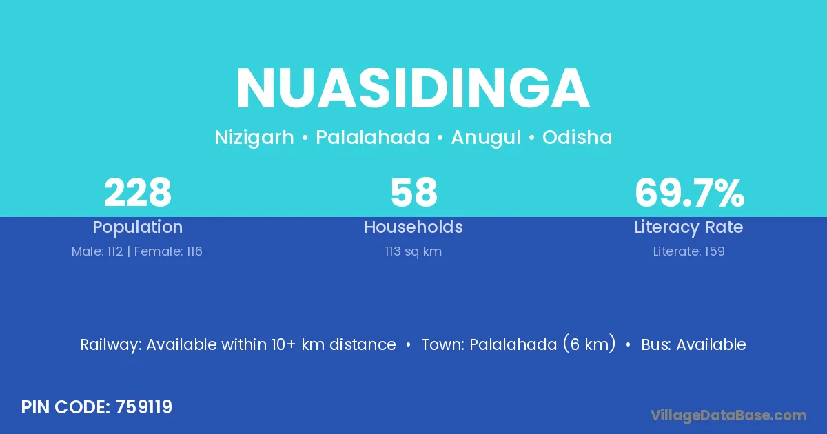 Palalahada (6 km) is the nearest town to Nuasidinga village for major economic activities and is located approximately 6 km away.