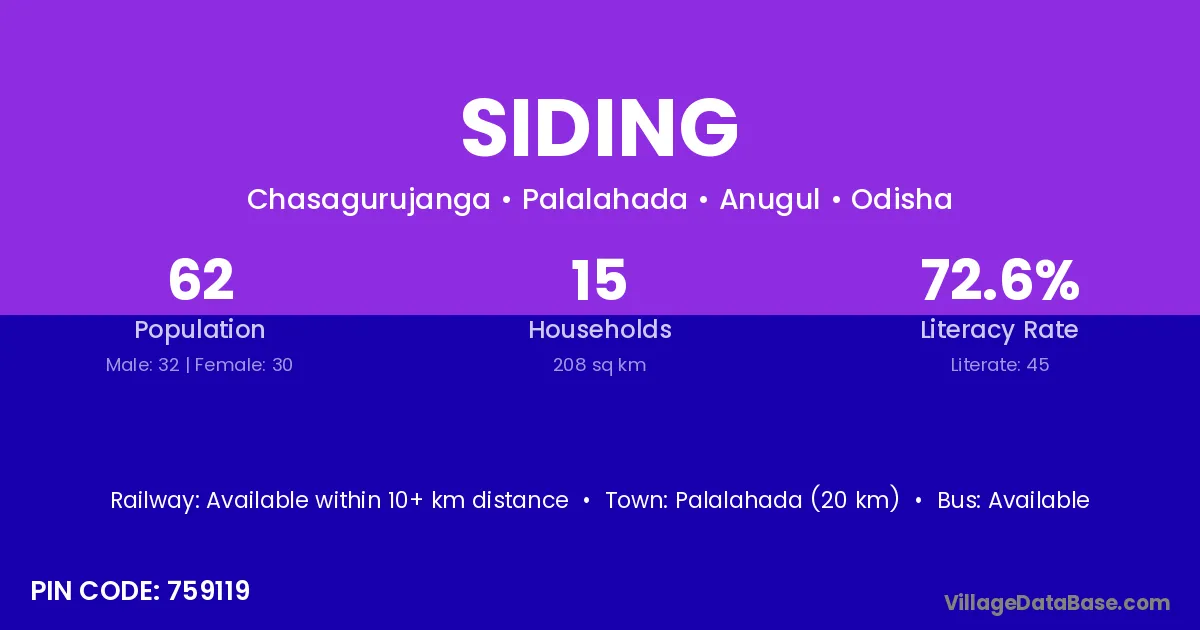 Palalahada (20 km) is the nearest town to Siding village for major economic activities and is located approximately 20 km away.