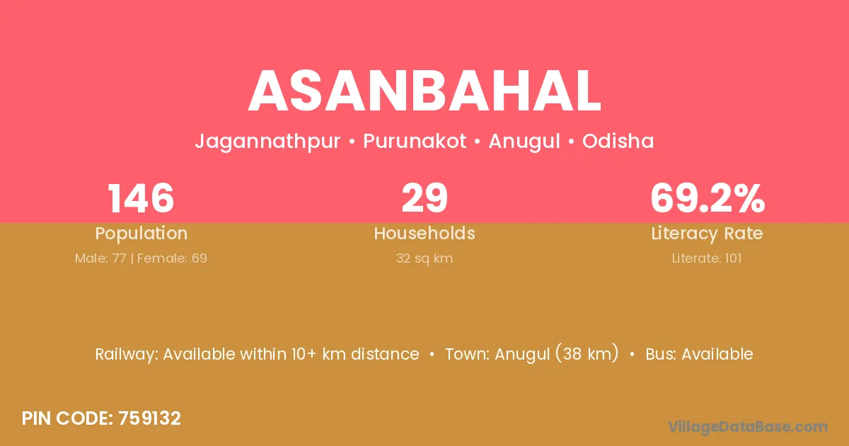 Asanbahal village has a total population of 146 people, of which 77 are males and 69 are females.