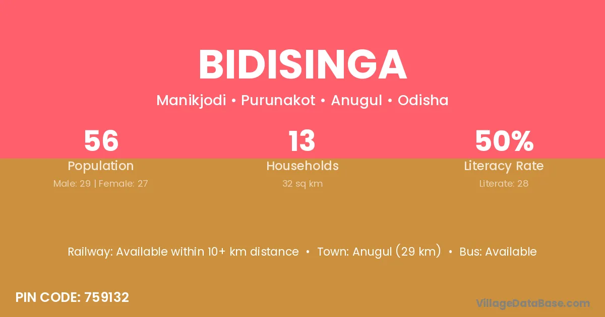 Anugul (29 km) is the nearest town to Bidisinga village for major economic activities and is located approximately 29 km away.