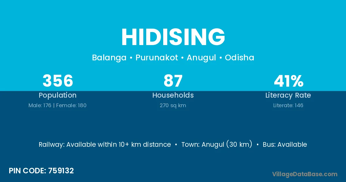 Anugul (30 km) is the nearest town to Hidising village for major economic activities and is located approximately 30 km away.