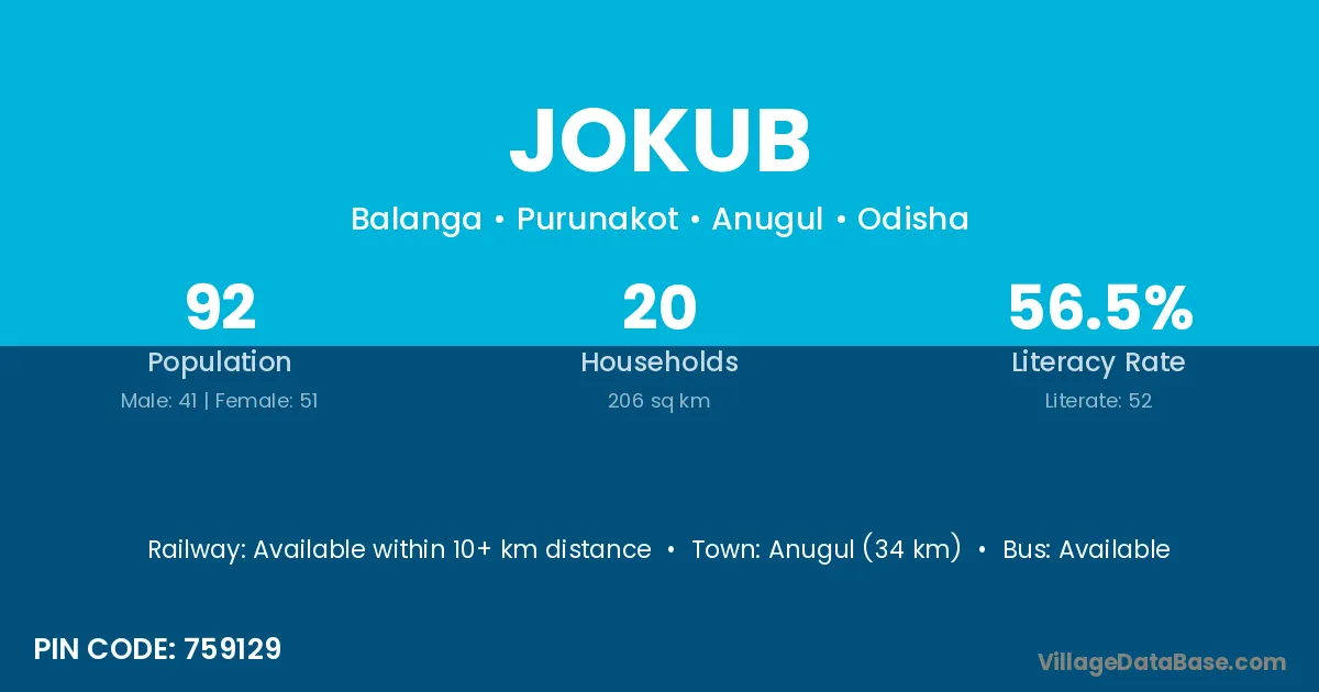 Anugul (34 km) is the nearest town to Jokub village for major economic activities and is located approximately 34 km away.