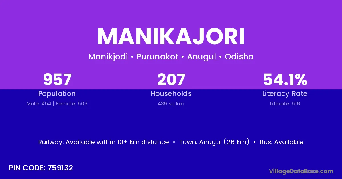 Anugul (26 km) is the nearest town to Manikajori village for major economic activities and is located approximately 26 km away.