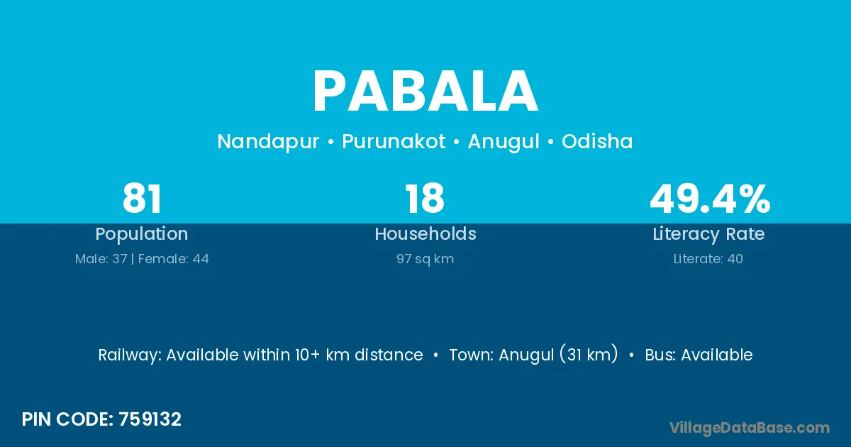 Anugul (31 km) is the nearest town to Pabala village for major economic activities and is located approximately 31 km away.