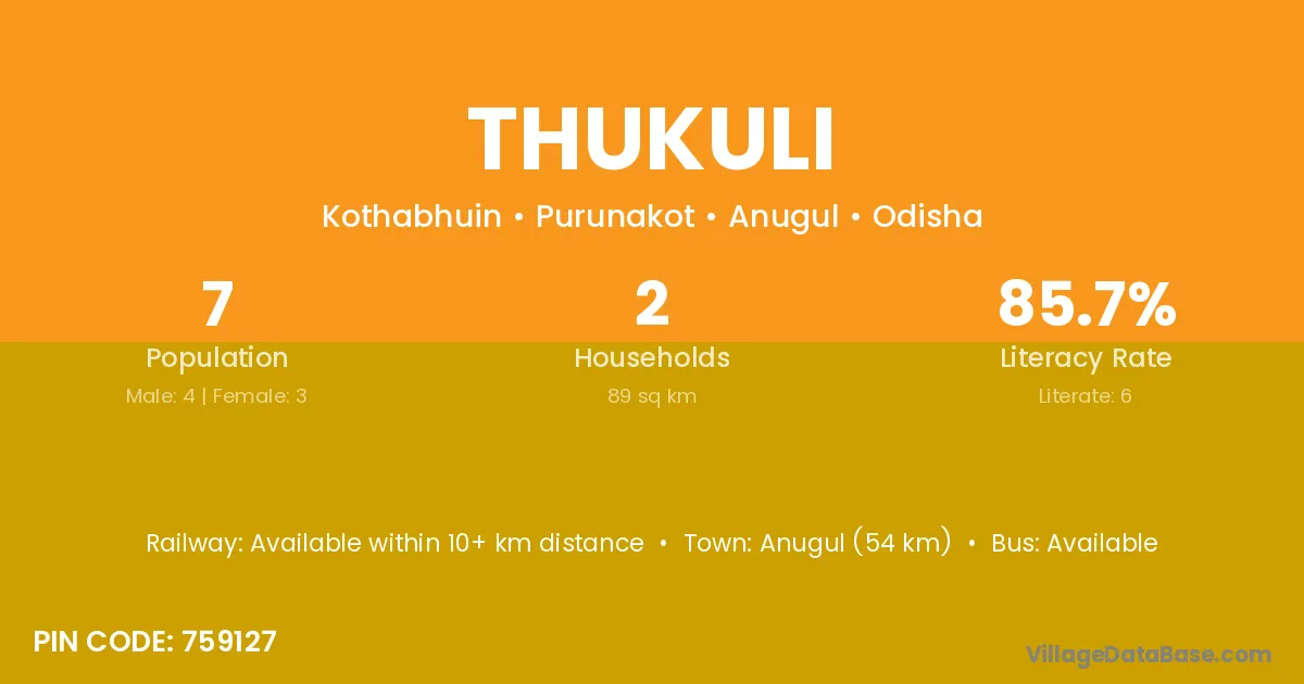 Anugul (54 km) is the nearest town to Thukuli village for major economic activities and is located approximately 54 km away.