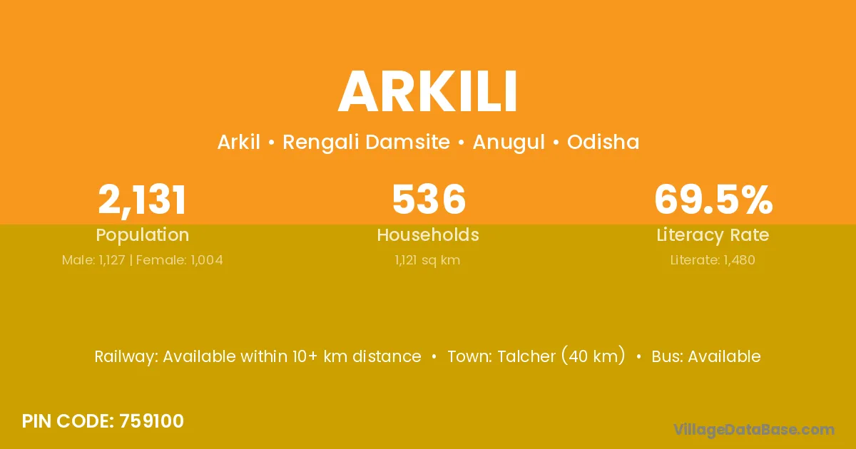 Talcher (40 km) is the nearest town to Arkili village for major economic activities and is located approximately 40 km away.