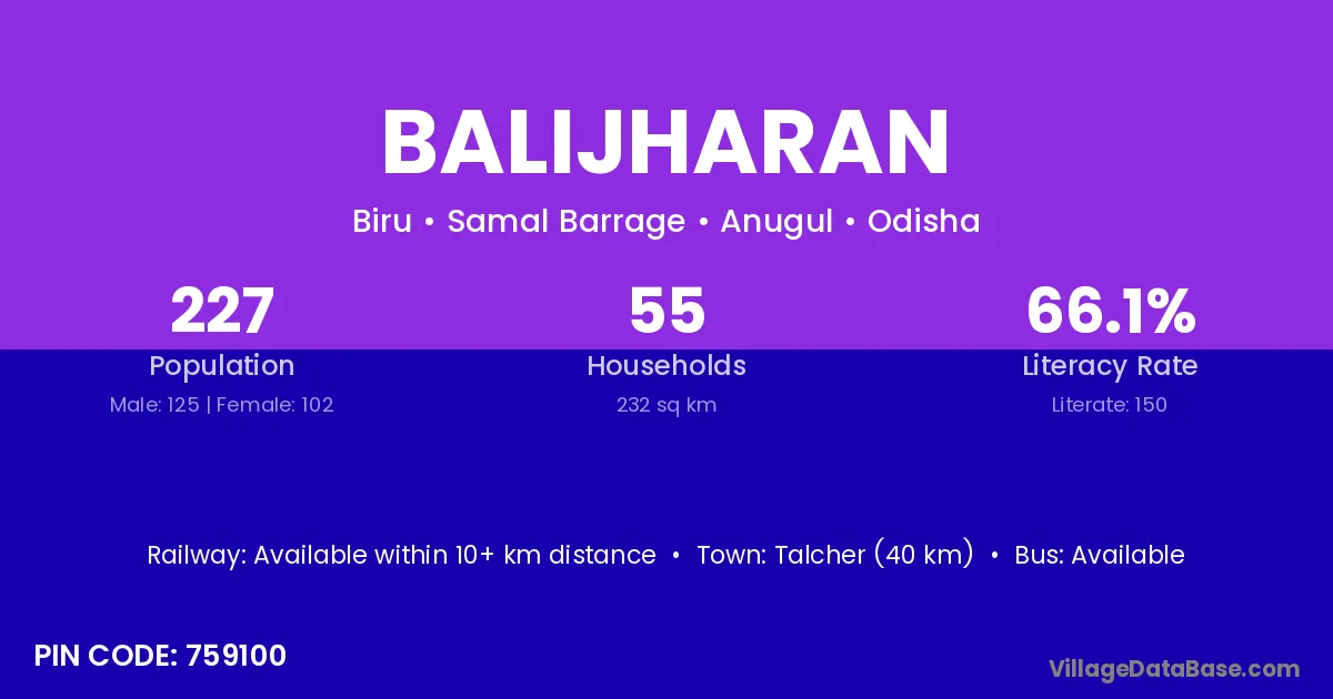 Talcher (40 km) is the nearest town to Balijharan village for major economic activities and is located approximately 40 km away.