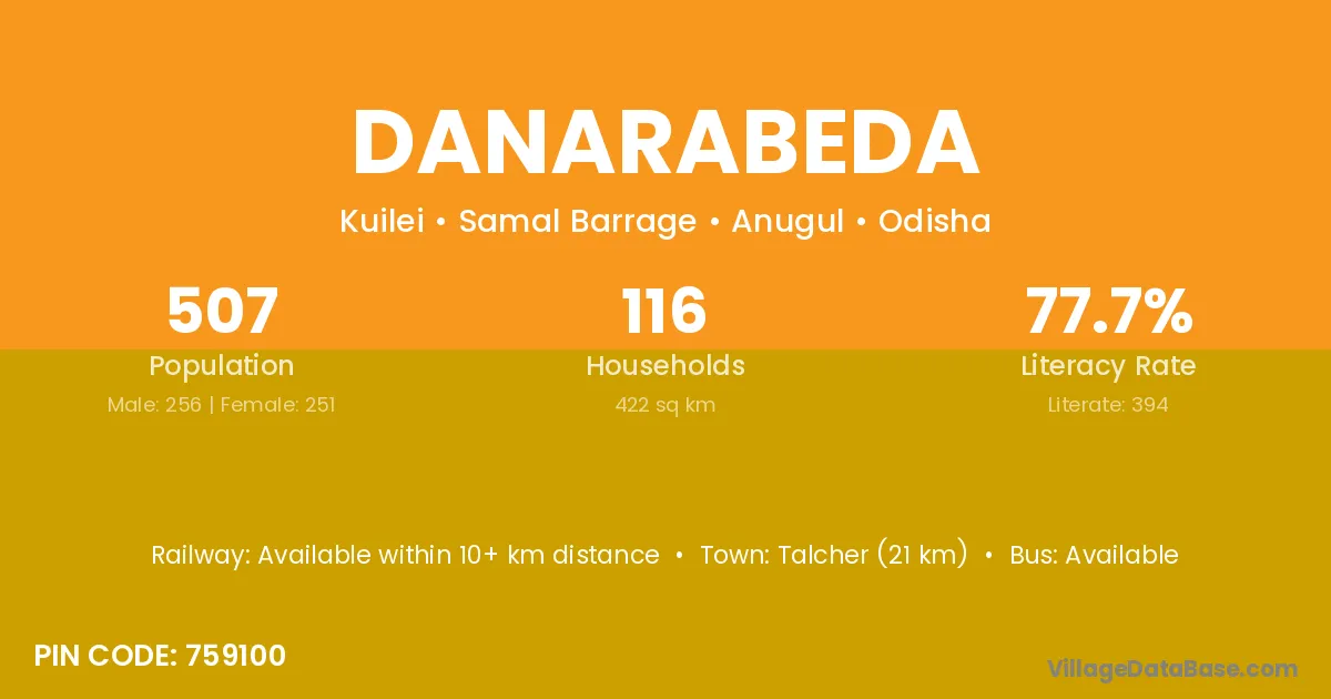 Talcher (21 km) is the nearest town to Danarabeda village for major economic activities and is located approximately 21 km away.