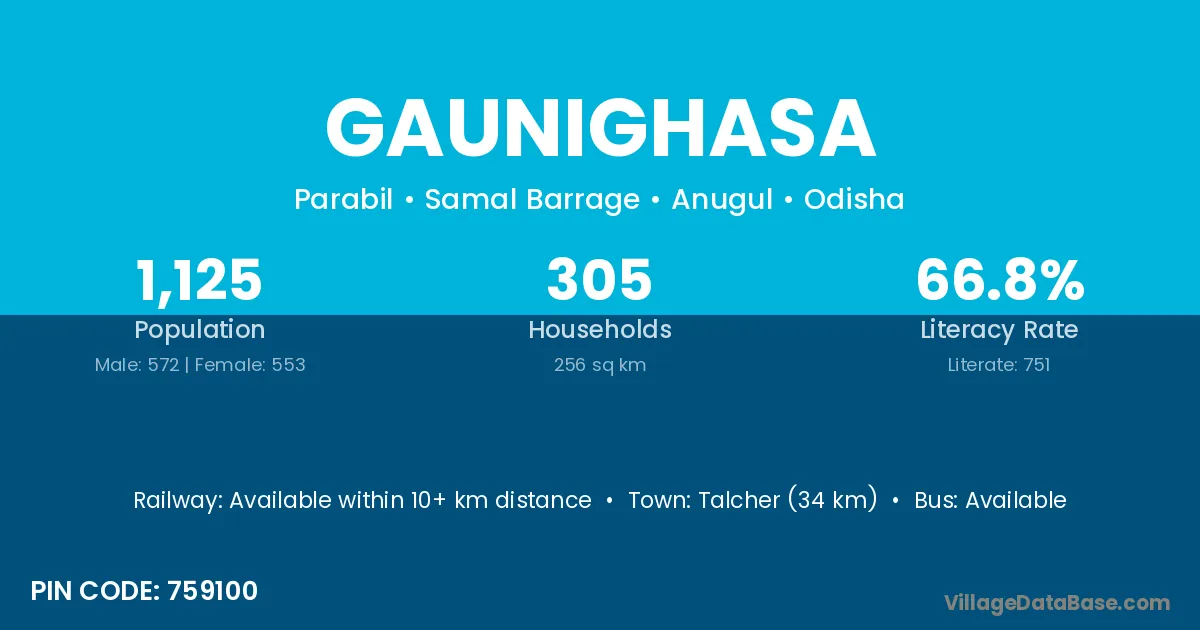 Talcher (34 km) is the nearest town to Gaunighasa village for major economic activities and is located approximately 34 km away.