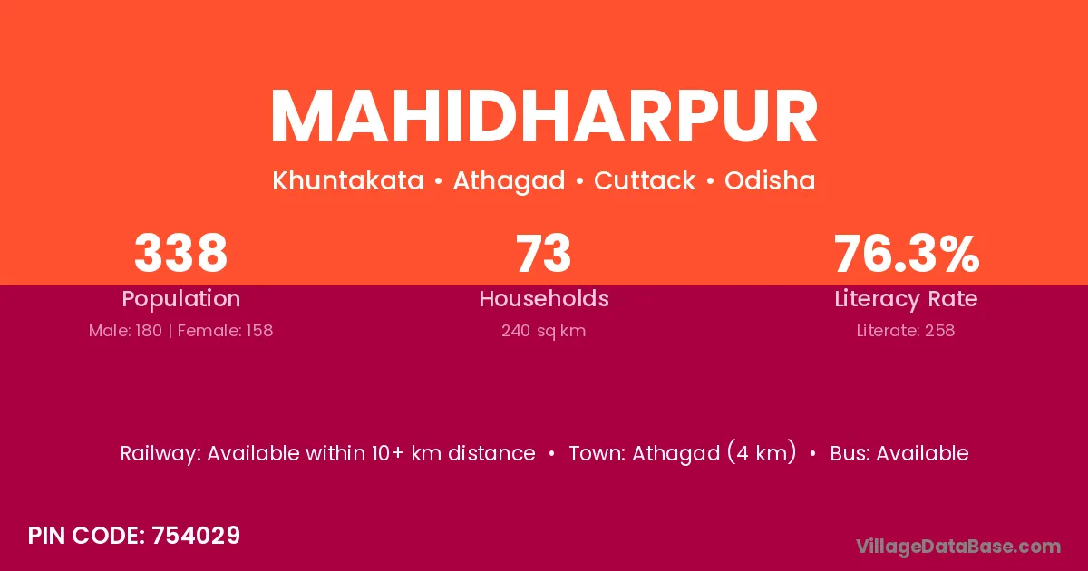 Talcher (40 km) is the nearest town to Mahidharpur village for major economic activities and is located approximately 40 km away.