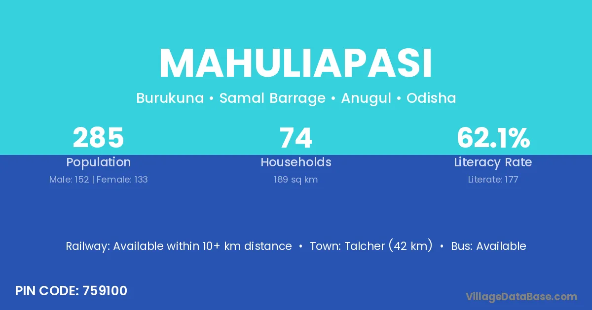 Talcher (42 km) is the nearest town to Mahuliapasi village for major economic activities and is located approximately 42 km away.