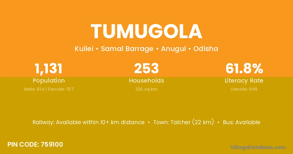 Talcher (22 km) is the nearest town to Tumugola village for major economic activities and is located approximately 22 km away.