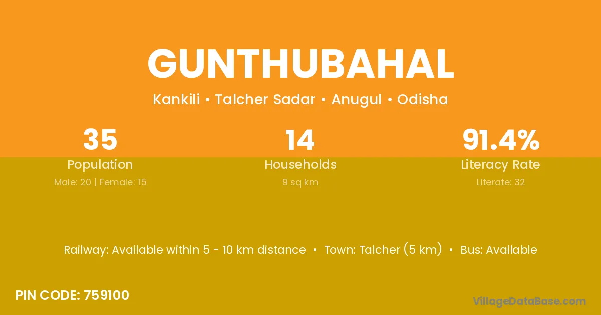 Talcher (5 km) is the nearest town to Gunthubahal village for major economic activities and is located approximately 5 km away.