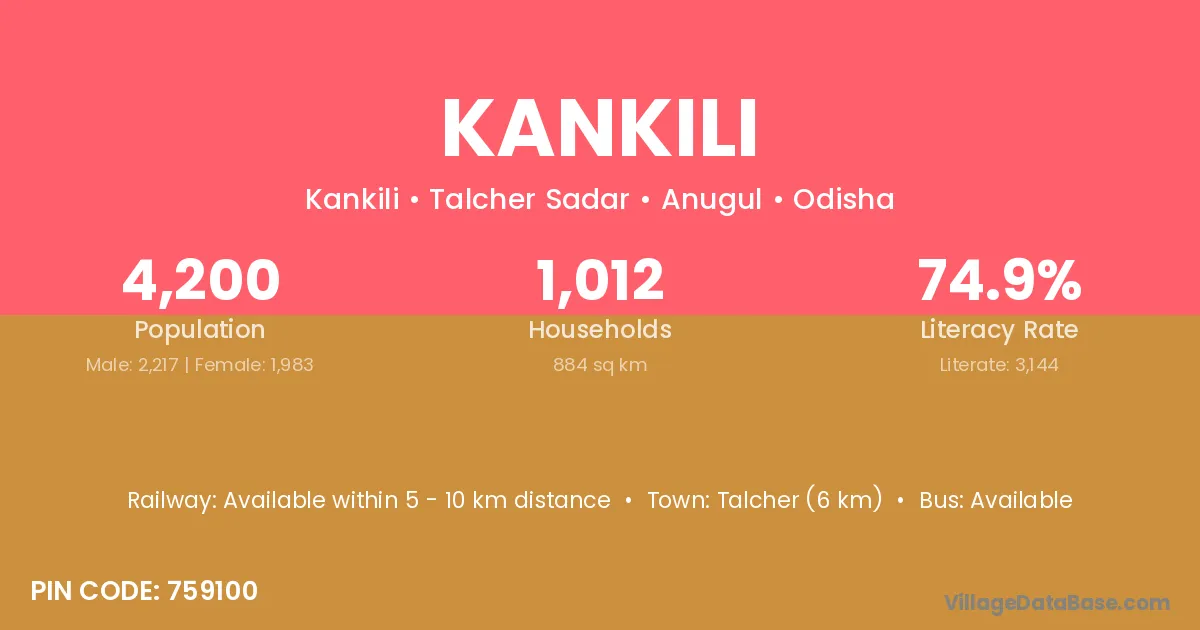 Talcher (6 km) is the nearest town to Kankili village for major economic activities and is located approximately 6 km away.