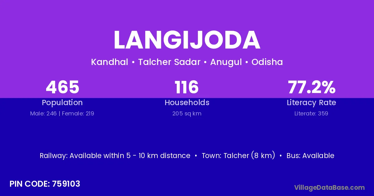 Talcher (8 km) is the nearest town to Langijoda village for major economic activities and is located approximately 8 km away.