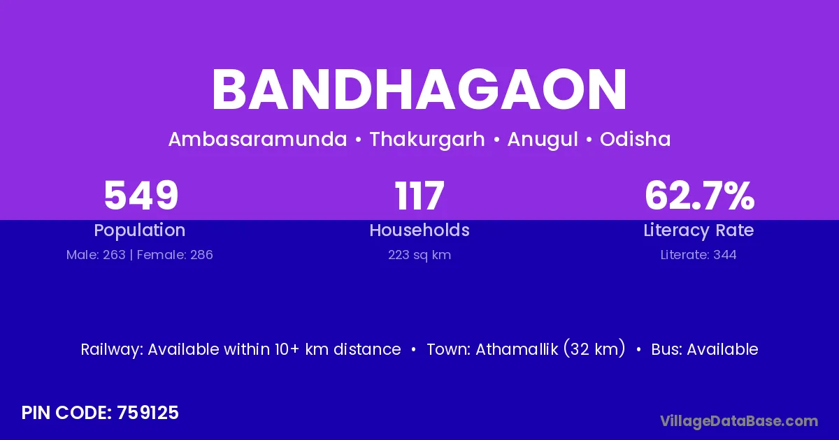 Athamallik (32 km) is the nearest town to Bandhagaon village for major economic activities and is located approximately 32 km away.