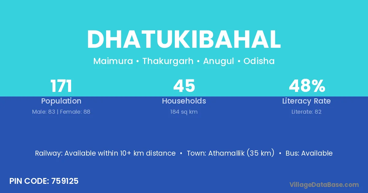 Athamallik (35 km) is the nearest town to Dhatukibahal village for major economic activities and is located approximately 35 km away.